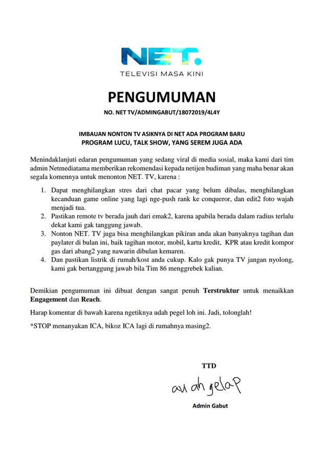 Dalam pengumuman itu juga tertulis imbauan untuk menonton NET TV.