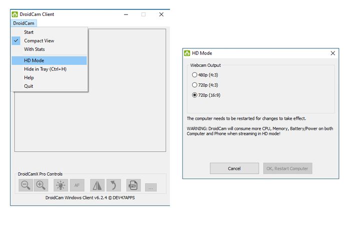 Anda bisa mengeklik [DroidCam] > [HD Mode] dan memilih [720p (16:9)] bila didukung untuk mendapatkan video yang lebih berkualitas. Dukungan video HD sendiri diklaim hanya dihadirkan pada versi berbayar.