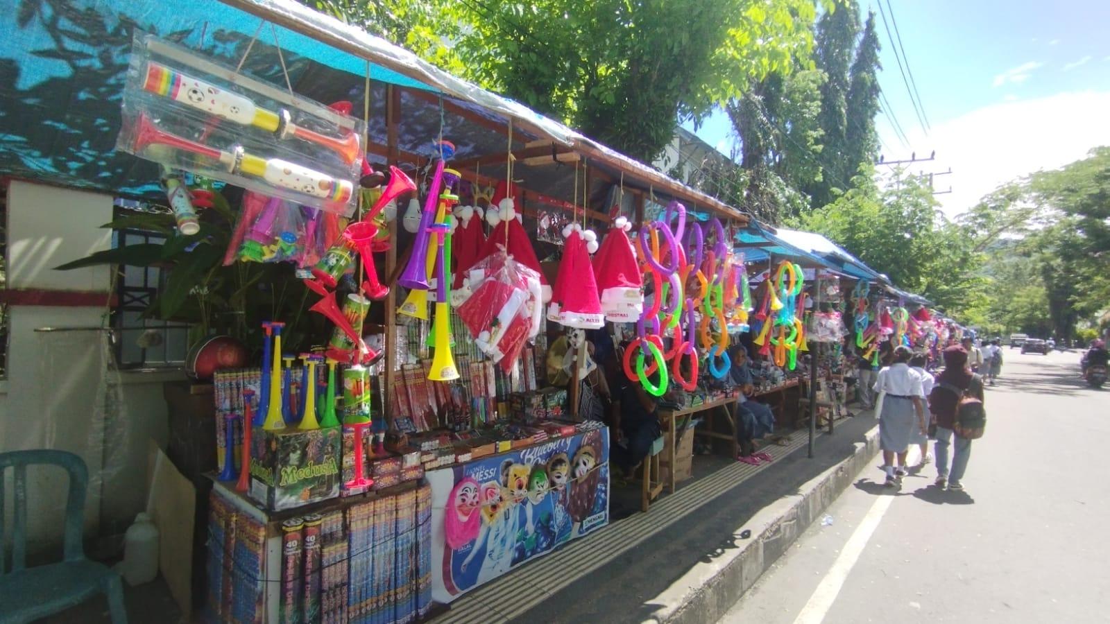 Di mana barang yang dijual dari kembang api, petasan, trompet, topeng bendana hinga topi natal di jual di sana.(*)