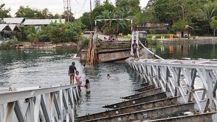 Bahkan beberapa anak-anak tak segan untuk berjalan di atas rangka jembatan yang ambruk ke laut dengan panjang berkisar 20 meter.