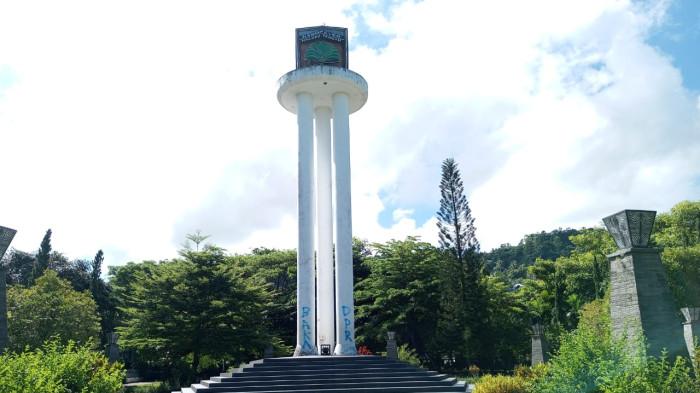 Pantauan TribunAmbon.com di lokasi sekira pukul 11.20 WIT Selasa (14/10/2025), Tiga tugu Pamahanunusa itu dicoret dengan tulisan 'Baka DPR', dan coretan emoji.