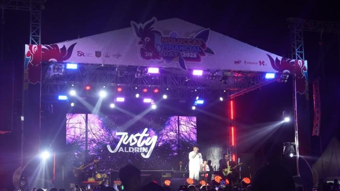 Laporan Jurnalis TribunAmbon.com, Silmi Sirati Suailo MASOHI, TRIBUNAMBON.COM - Muda-mudi warga Maluku Tengah 'galau' bersama musisi Justy Aldrin saat tampil menyanyikan lagu-lagunya di puncak Pagelaran Moluccas Financial Day 2025. Justy Aldrin tampil apik membawakan lagu-lagunya yang disaksikan ribuan pasang mata di kawasan Dermaga Feri Ina Marina, Kota Masohi, Sabtu (8/11/2025) malam. Justy, musisi Indonesia Timur yang lahir dan besar di Kota Masohi itu membawakan lebih dari lima lagu yang bertemakan kisah cinta dan patah hati. Dengan gaya khasnya, Justy menghipnotis muda-mudi, ada yang histeris, tertawa, bahkan menumpahkan air mata. Lagu yang banyak mendapat sorotan ialah lagu 'Hilang', dimana Justy mengajak seluruh penonton tuk bernyanyi bersama. Dermaga Feri Ina Marina yang biasanya sepi, kini menjadi saksi bahwa Maluku Tengah tak kalah ramainya dengan Ibu Kota Maluku. Di tengah performance, Justy mengajak warga Maluku Tengah untuk bangga dan mendukung musisi-musisi dari Indonesia Timur. "Beta mau pesan untuk semua, mari sama-sama Katong (kita) bangga dan dukung musisi dari Timur Indonesia," ajak Justy.